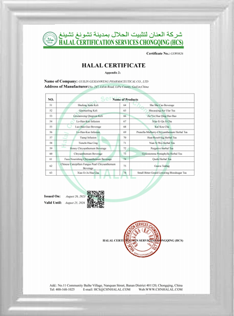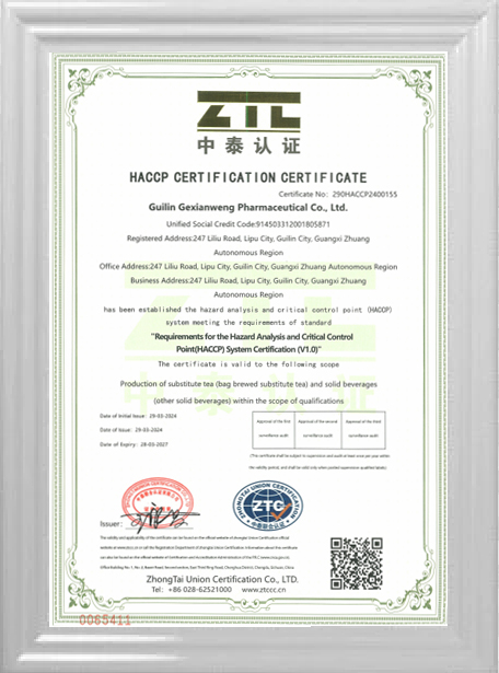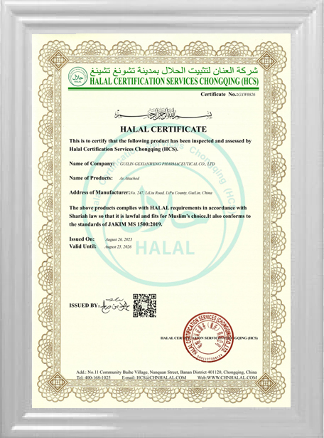 Guilin Gexianweng Pharmaceutical Co., Ltd. didirikan pada tahun 1985 dan merupakan perusahaan saham gabungan yang menghasilkan obat-obatan dan makanan kesehatan dengan cara yang beragam. Butiran, tablet, kapsul, bubuk dan pil yang ada ada. Ada banyak jalur produksi modern seperti sirup dan solusi lisan, yang telah menerapkan sistem jaminan kualitas produksi yang baik dan terus lulus sertifikasi GMP dan sertifikasi HACCP. Pada tahun 2022, itu bernama perusahaan 'merek yang dihormati waktu Guilin'